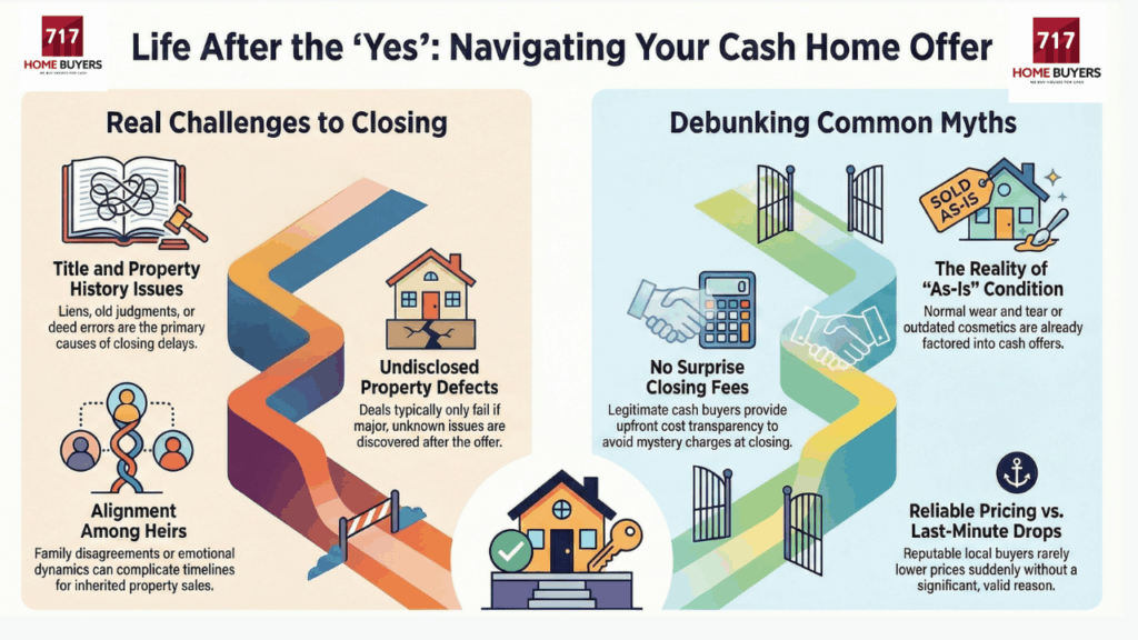 After you accept a cash offer, the only things that usually cause real problems are title issues, undisclosed property problems, and decision-maker conflicts (especially with inherited homes). Most cosmetic condition issues do not matter because they are already accounted for in an as-is cash offer. This is NOT the right choice if you are not ready to cooperate with the title company paperwork or you have unresolved family or ownership disputes that you are unwilling to address.